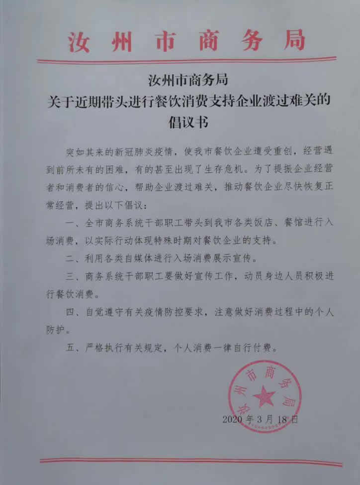 汝州市商务局关于近期带头进行餐饮消费支持企业渡过难关的倡议书