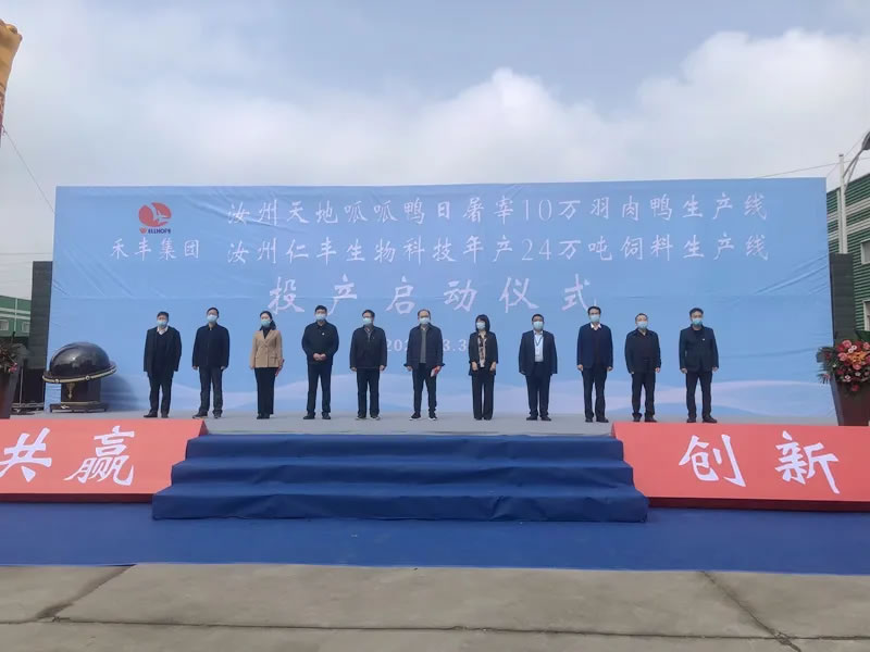 3月30日,汝州市举行禾丰集团汝州天地呱呱鸭日屠宰10万羽肉鸭生产线暨汝州仁丰生物科技年产24万吨饲料生产线投产仪式。