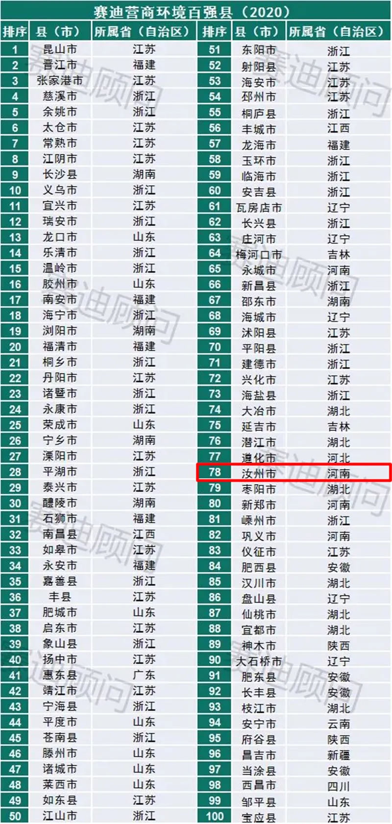 《赛迪营商环境百强县2020》在北京发布,汝州市再次上榜!第78位